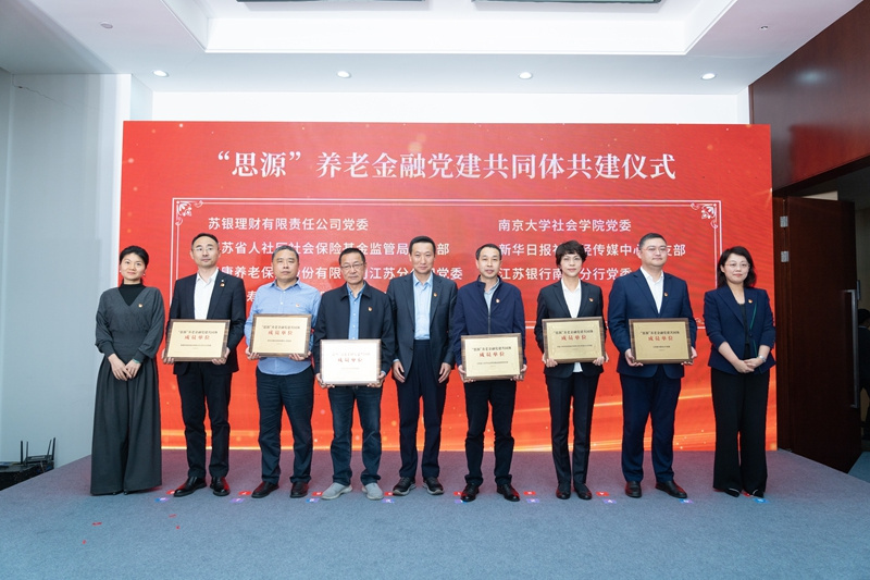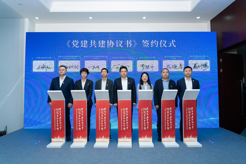 苏银理财有限责任公司、成人漫画 、江苏省人社厅社会保险基金监管局、新华日报社财经传媒中心、中国人寿养老保险股份有限公司江苏省分公司、泰康养老保险股份有限公司江苏分公司、江苏银行南京分行七家成员单位代表上台签署《党建共同体共建协议书》。