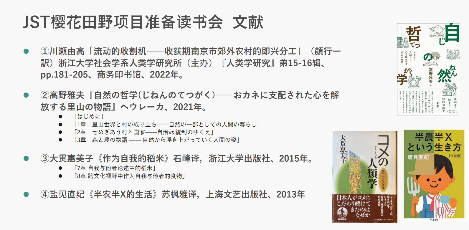 在项目开始之前,我校师生根据日方老师提供的书单展开了多次线上读书会交流活动。其中包含《流动的收割机》(川濑由高2022)、《作为自我的稻米》(大贯惠美子2015)、《半农半X的生活》(盐见直纪2013)、《自然的哲学》(高野雅夫2021)等。通过阅读这些书籍,一方面,我们就日本农村、农业以及农民的情况积累了一定的基础知识,并对稻米与日本人的身份认同、里山与日本农村的发展等有了基本的理解。另一方面,从中日对比的视角,我们也发现不同于中国农村的日本农村的发展特点,并由此产生了许多疑问。这些都有待实际赴日之后进行逐一确认和解答。