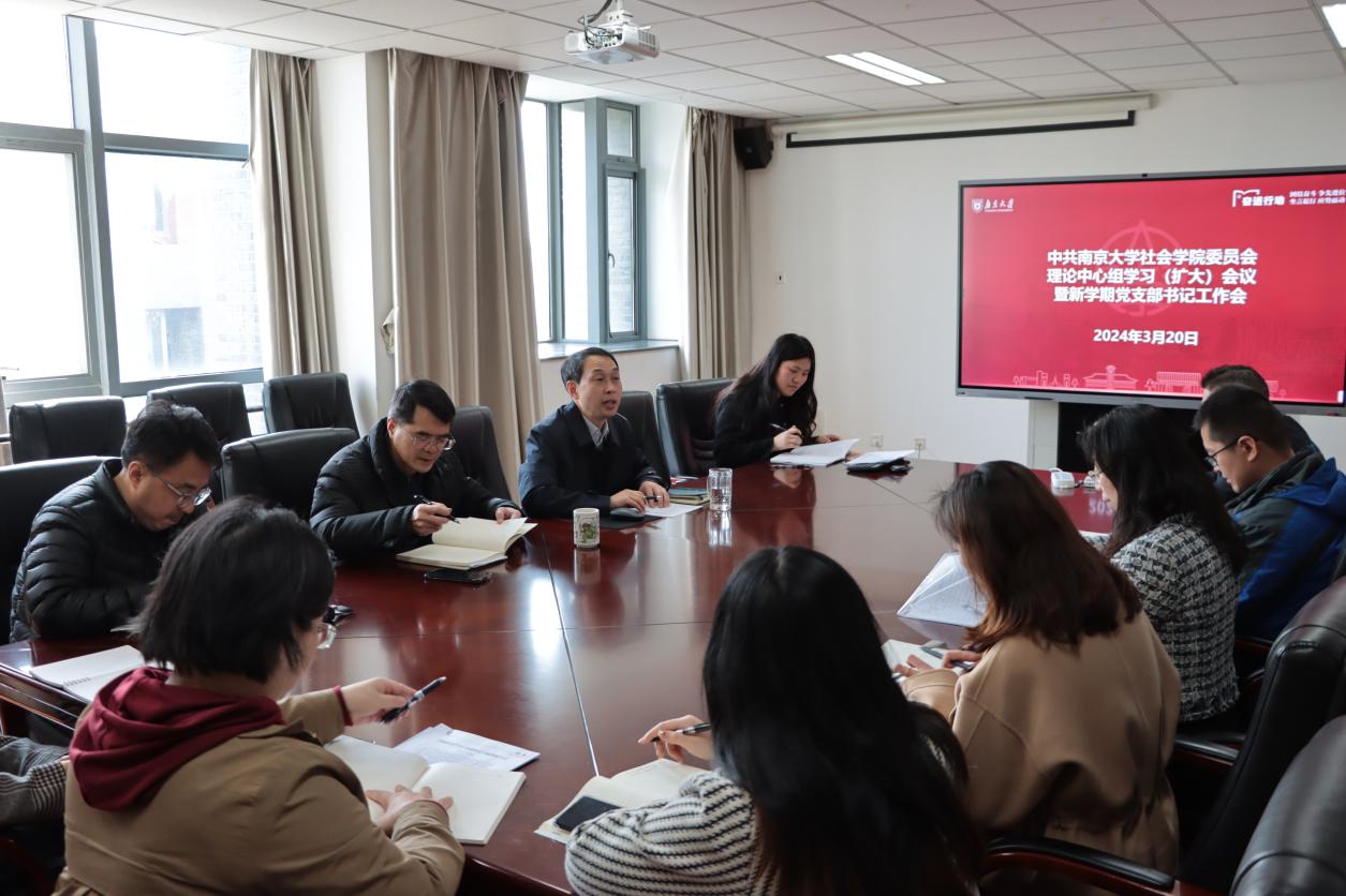 学院党委副书记、院长吴愈晓强调,党员干部要发挥先锋模范作用,带头积极学思践悟全国“两会”精神,结合学科特色,通过创新生态培育、人才队伍建设、创新平台打造等多方面入手,持续打造新质生产力,扎实推进南大社院的高质量发展。学院党委副书记沈晖,副院长陈家建、郭未、肖承丽以及社会学系教工党支部书记胡小武、社会工作与社会政策系教工党支部书记田蓉、心理系教工党支部书记李岩松、博士第二党支部书记马逸轩、学硕第三党支部书记赵文君等师生围绕两会内容和发展新质生产力展开热烈的交流讨论。