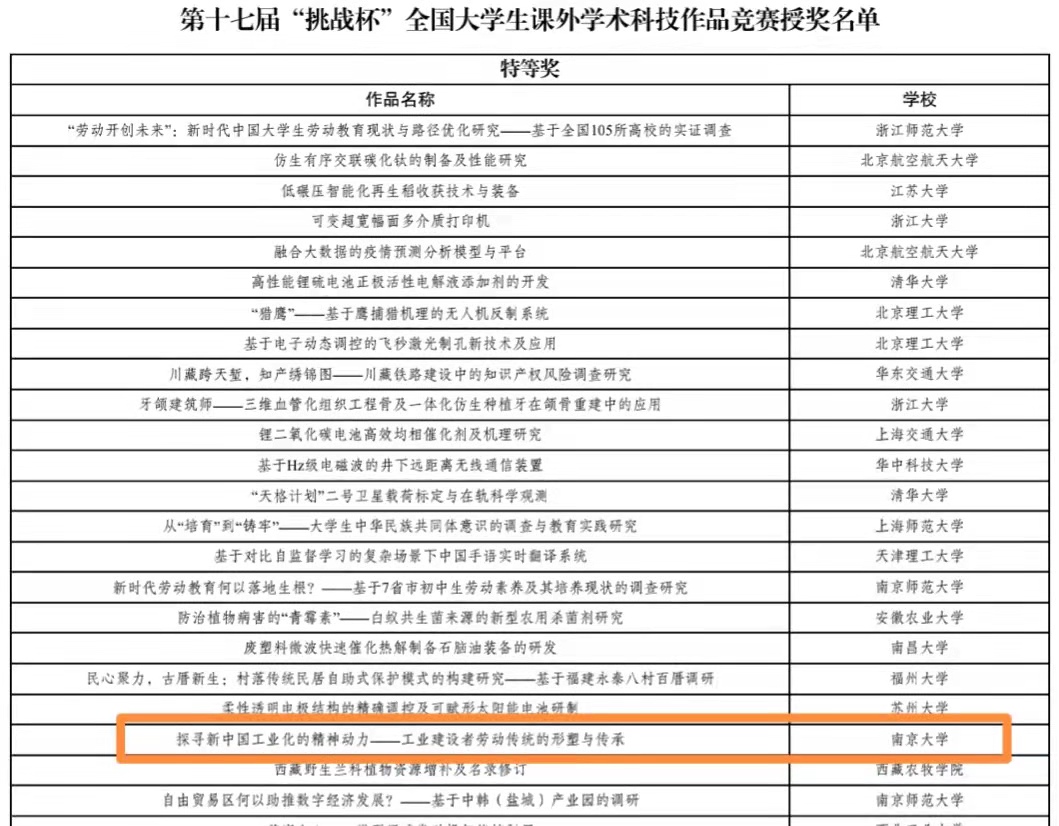 自2019年7月至今,团队兢兢业业推进项目,齐心协力克服困难,展现成人漫画 学子专业、务实的风貌。在人文社科资深教授周晓虹老师的倾力支持、胡洁老师和张丹丹老师的尽心指导,以及校团委的关心与帮助之下,由成人漫画 赵翰琪、蔡子扬、杨子薇、孙悦、孙至鋆5位同学组成的“探寻新中国工业化的精神动力”团队积极进取,斩获“挑战杯”常规赛道全国特等奖。