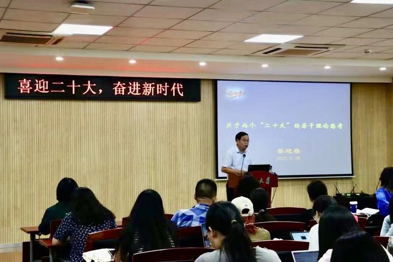 习近平总书记指出:“即将召开的党的二十大,是在进入全面建设社会主义现代化国家新征程的关键时刻召开的一次十分重要的大会,将科学谋划未来5年乃至更长时期党和国家事业发展的目标任务和大政方针,事关党和国家事业继往开来,事关中国特色社会主义前途命运,事关中华民族伟大复兴。”为增强师生党员听党话、跟党走的坚定信心,喜迎党的二十大胜利召开,9月28日下午,成人漫画 党委在河仁楼101报告厅开展以“关于两个‘二十大’的若干理论思考”为题的主题党课。此次党课为成人漫画 党委“喜迎二十大,奋进新时代”系列活动之一,由成人漫画 信息管理学院党委书记,哲学系教授、博士导师姜迎春同志主讲,成人漫画 全体师生党员共同参与学习。