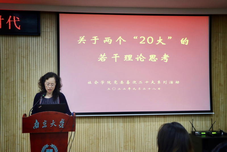 姜迎春教授首先带领师生党员深入剖析党的二十大的重大意义,指出二十大的胜利召开将进一步推进马克思主义中国化,进一步推动全党的理论自觉,进一步推动中国特色社会主义事业发展和社会主义现代化强国建设,进一步推动全党、全社会凝聚共识、统一思想,进一步推动世界社会主义运动的发展。